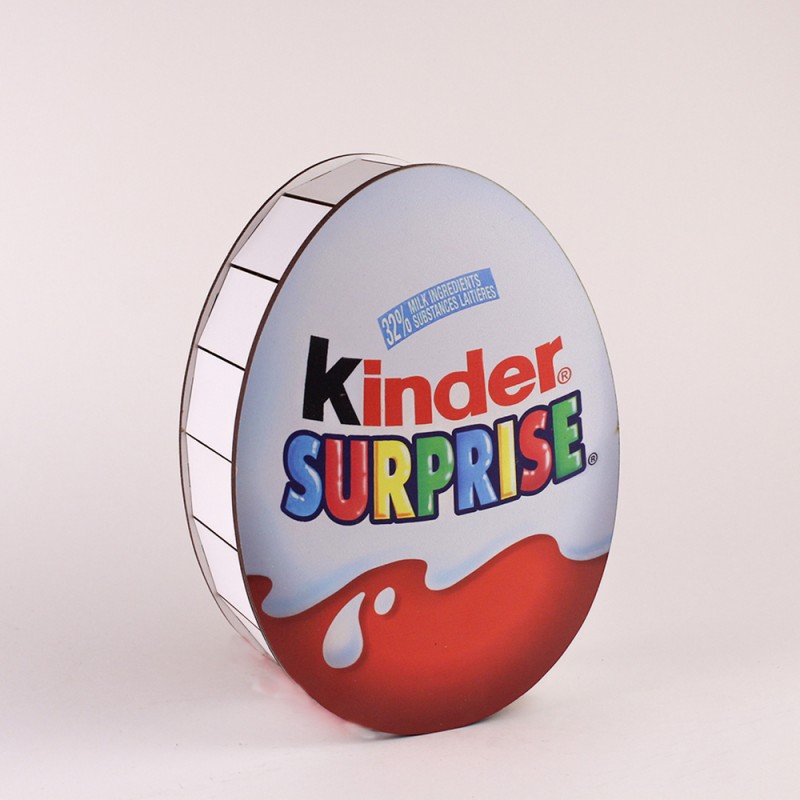 Drewniane pudełko zawiera pokrywkę z obrazkiem”kinder”.
